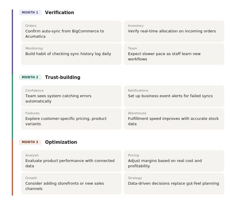 The first 90 days on Acumatica as a BigCommerce business will follow a clear arc: Verify that the connection works, build trust as your team sees the system catching things they used to miss, and then optimize as you gain confidence and data. It's a progression, not a switch you flip, and the businesses that approach it with that mindset will see the smoothest transitions.